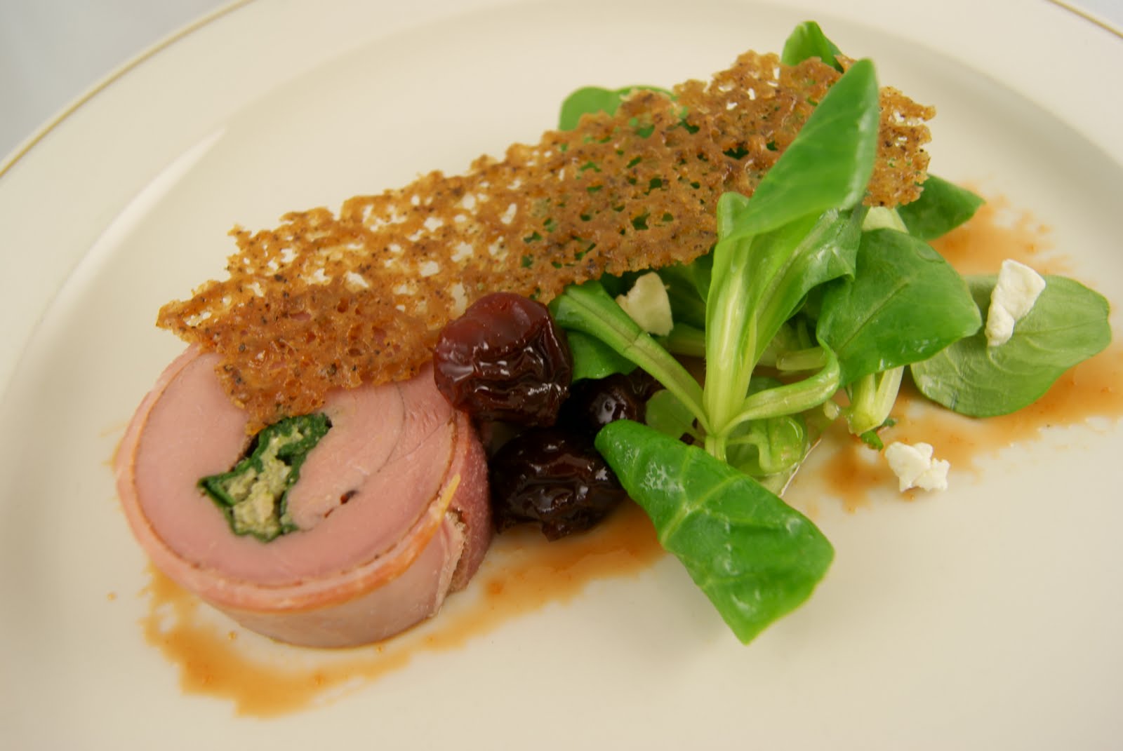 The dish is “Duck, Foie Gras and Pistachio Terrine with Cherry Gastrique, Mache with Honey-Thyme Vinaigrette, Split Creek Farms Chevre, Spiced Tuile”.