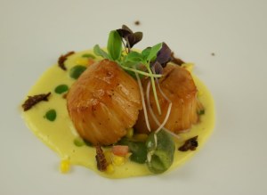 For the scallop I cold smoked U-10 sea scallops after making sure they were very dry. After lightly smoking, I seared them and then brushed them with a molasses glaze that was equal parts molasses and veal stock. The veal stock tames the sweetness and also adds a deeper, richer background flavor for the molasses.