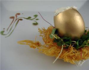 This dish is “The Goose and the Golden Egg”. The “goose” in this dish being a foie gras custard. Technically the foie gras we use is duck liver (grade A Hudson Valley), but historically it was goose liver so I took some poetic license. The rest of the dish is a crispy potato nest, local microgreens with a pear vinaigrette and truffled whipped cream. The whipped