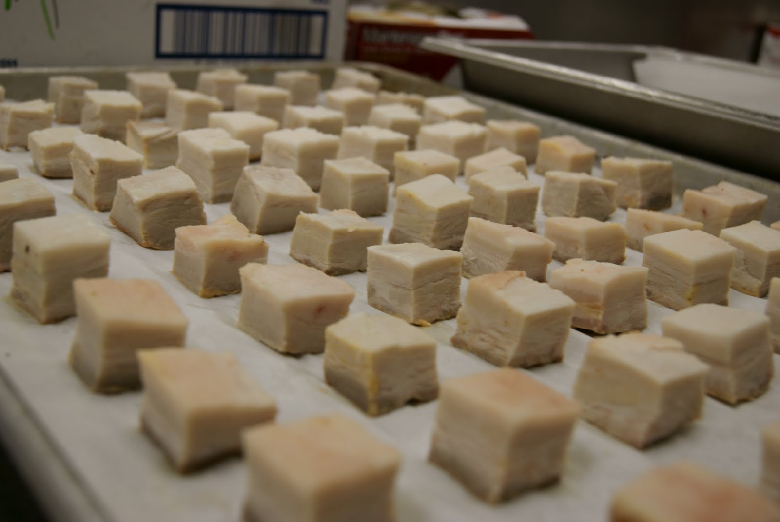 it dry with a towel. One thing that I’ve found about working with pork belly is that if you’re going to remove the skin then it’s best to do it after you’ve cured and cooked the meat. At that point it will come off with minimal assistance from a flexible filet knife. At this point I portioned the pork into about 1.5”x1.5” cubes for a proper hors d’oeuvre. For an appetizer for a separate dinner I made 3”x3” portions.