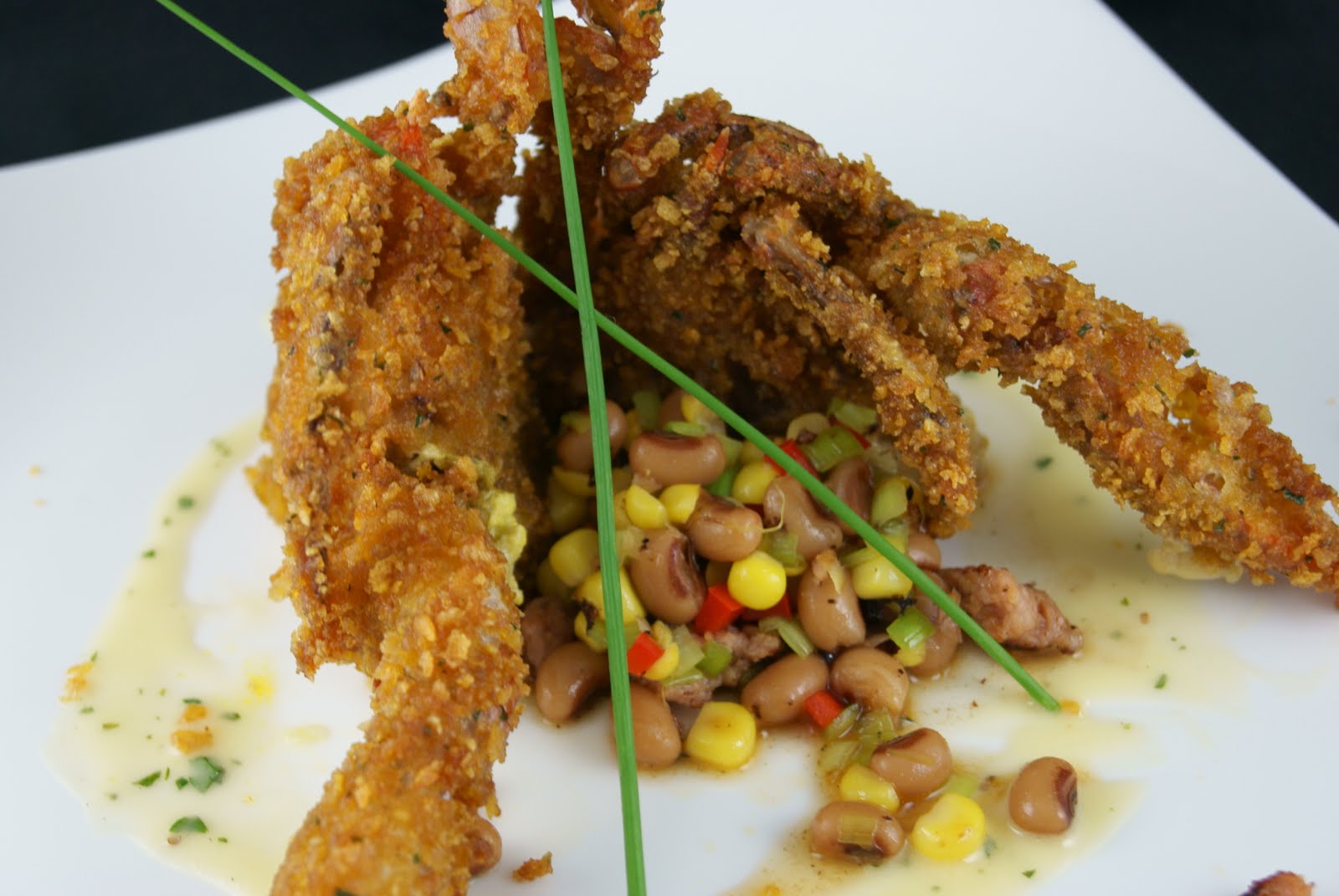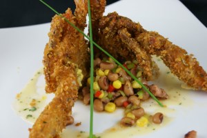 In preparing these soft shells I use a Corn Flake crust, using the typical Kellogg’s breakfast cereal. This recipe was adapted from one that a great sous chef I used to work for used while I was in Baltimore. I use equal part panko bread crumb and cornflakes, then spin them quickly in the food processor. I add about two tablespoons of Old Bay seasoning and two tablespoons of freshly chopped parsley. Then I grind it all again in the food processor quickly. The reason that you don’t want to add the parsley in the beginning is because you just want to mix it through…if you add it in the beginning then it can color the breading green. Use a standard breading procedure when preparing the crabs. Dredge them in flour to give the breading something to stick to, and then dip in an egg wash, then into the breading. The key to making this really crispy is to go right into the fryer after breading, rather than holding this cold. If you hold it after breading then the breading will take on moisture from the product and from the humidity of the refrigerator.