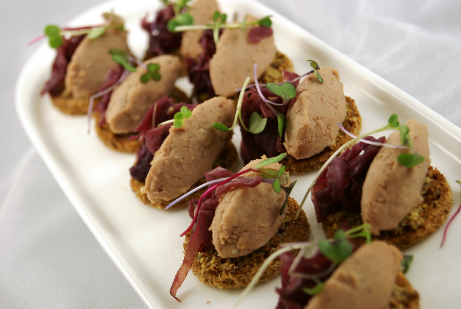 The main component of this hors d’oeuvre is the duck rillette. Rillette, like the name sounds, is a traditional French preparation. It is kind of a poor man’s pate. The term “rillette” means that a meat has been cured, then cooked slowly in fat until tender, then pureed to a paste and served at room temperature. Like so much of charcuterie, the process of making rillette began as a way to preserve meats when folks didn’t have the luxury of refrigeration. A rillette of pork, duck, rabbit, or just about any other meat can be jarred and covered in the oil it was cooked in, preserving it for long amounts of time as long as no bacteria is introduced into the fat.
