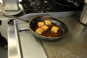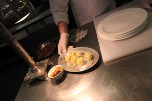 The pappardelle noodle is cooked, then seasoned with kosher salt and freshly ground pepper, then sprinkled with shaved parmesan-reggiano. It’s then rolled up and picked, to be reheated in the steamer with a little chicken stock to keep it from drying out. I like this preparation…it’s difficult sometimes to present pasta tastefully on a composed plate. This presentation accomplishes that and brings the pork off the plate as well.