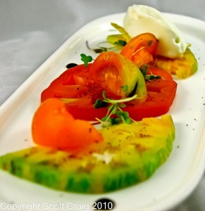 This dish is an example of great ingredients simply prepared to make a really enjoyable dish. On the plate I have heirloom tomatoes from Fisher Farms, micro swiss chard from Lucky Leaf Garden, a very nice Extra Virgin olive oil, balsamic reduction and seasoned with toasted and freshly ground black pepper and coarse sea salt. Adding a little fun to the dish is a Parmesan-Reggiano crisp and Parmesan-Reggiano sorbet. The crisp and the sorbet adds texture and the novelty of differing temperatures to keep the dish interesting from start to finish.
