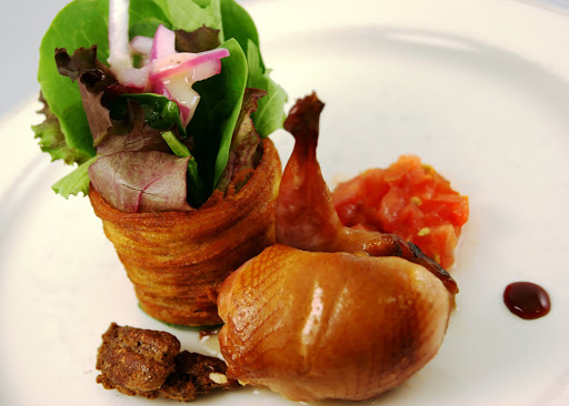 The greens were tossed in a caramelized shallot vinaigrette beforehand, the sweetness of it working nicely with the tart tomatoes, the salty potatoes and the smoky, brined quail. For the vinaigrette I used sliced shallots that had been seasoned and slowly caramelized, honey, fresh thyme, apple cider vinegar, white balsamic vinegar, whole grain mustard and salad oil. The ratio was roughly two parts oil to one part vinegar, with just enough mustard to emulsify the vinaigrette, honey balance the flavor and the thyme was added at the very end. One thing to note is that any time you use fresh herbs in a vinaigrette they will lose color quickly, so if that’s important to you then wait until just before service to make the vinaigrette.