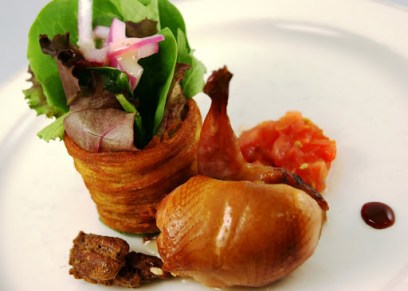 Last week I needed a salad that could pair with a pinot noir. This isn’t something that you see everyday…I needed big flavors to stand up to this robust wine. I settled on Roasted, smoked quail with field greens tossed in a caramelized shallot vinaigrette in the potato crisp.