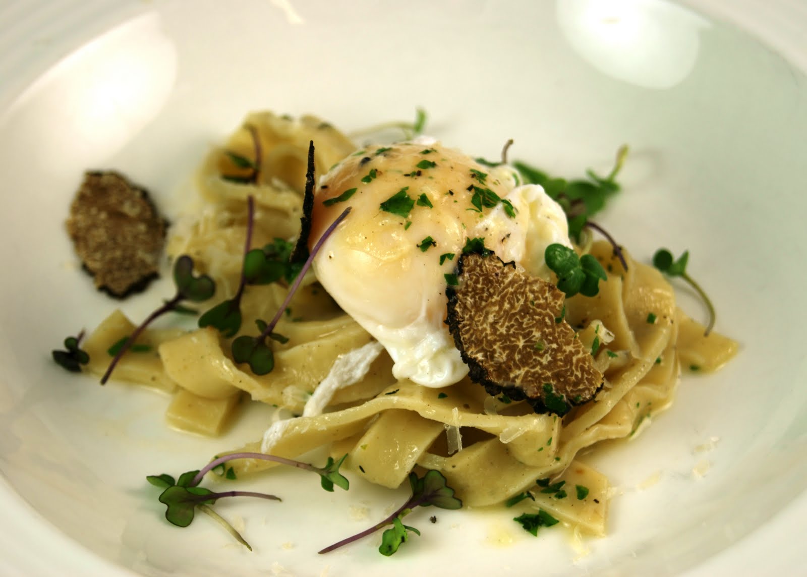 This dish is Truffled Fettuccini Carbonara. Carbonara is a classic Italian dish with its names origin (corbone) meaning “coal”. This simple coal miners dish is traditionally made with spaghetti or fettuccini and is always accompanied by egg, black pepper and pecorino cheese. Variations include peas or other vegetables, mushrooms, and pork.