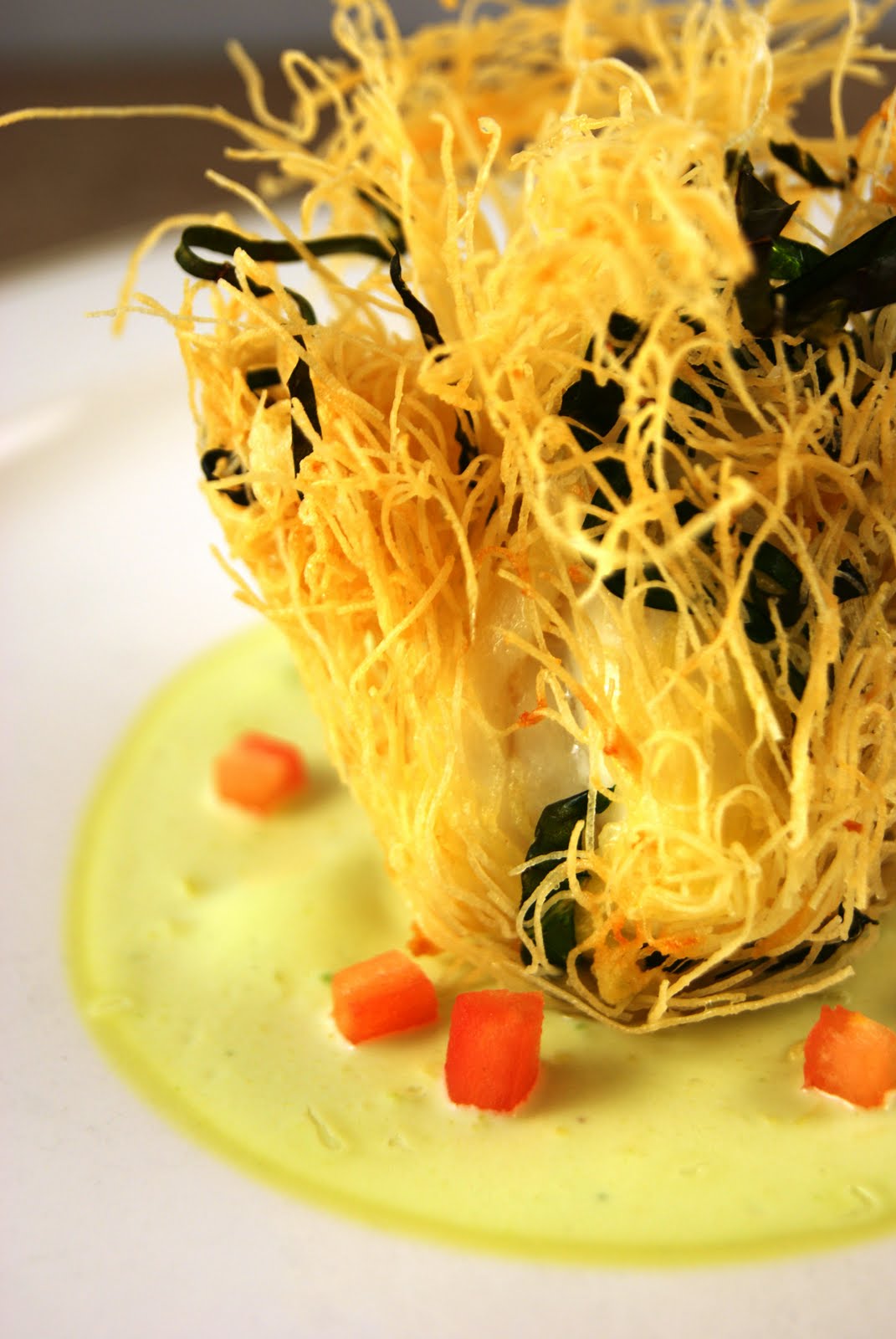 A paupiette of sole and lobster has a nice delicate flavor, but it can be boring to eat. To add some texture (a lot of texture), the paupiettes were dipped in egg wash then tossed with a chiffonade of collard greens and kataifi in a preparation inspired by Michel Richard.