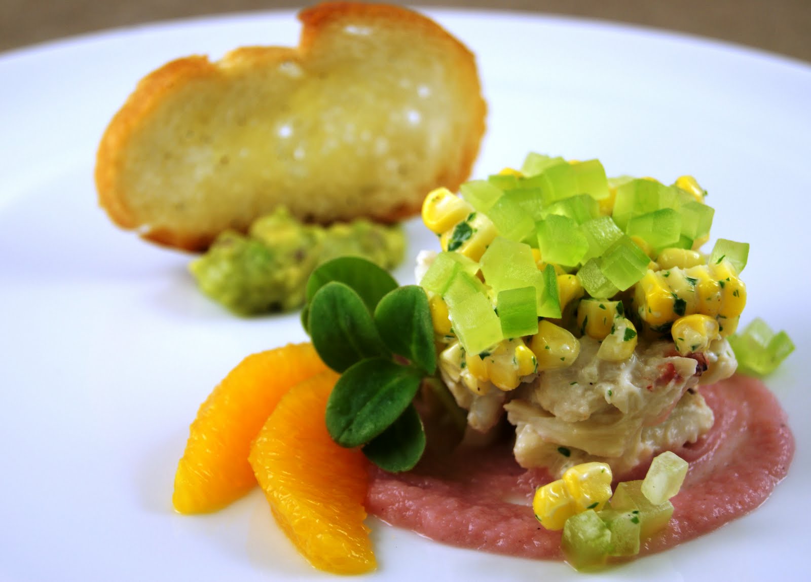 The rest of this dish consists of fresh roasted corn, guacamole and a dressing of Xeres vinegar and mayonnaise. There is also the roasted radish puree from last week, and you’ll notice that the color looks better. The radishes were roasted for a shorter amount of time, giving it better color and a lighter flavor. Also of note on this dish is the compressed cucumber, which is like cucumber squared. It was made by peeling, then vacuum packing the cucumber on the cryovac machine’s highest setting, pulling out the two things that always kill flavor: Air and water. It took on a dense, glassy appearance and intense flavor.
