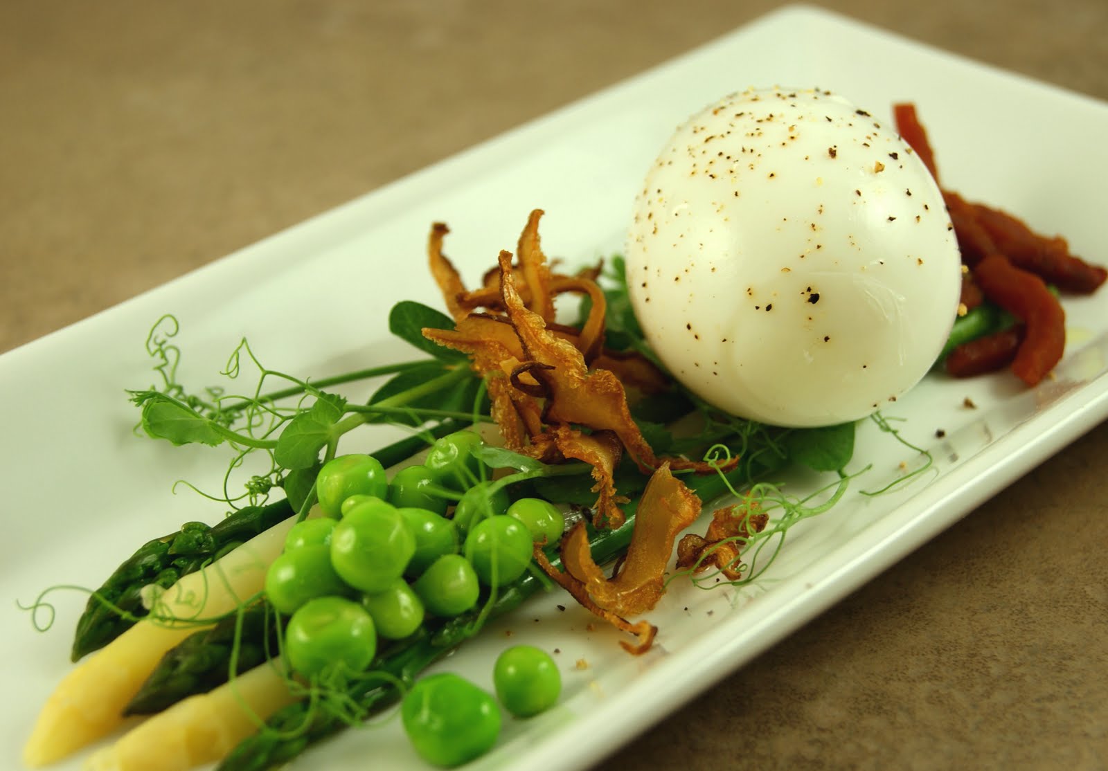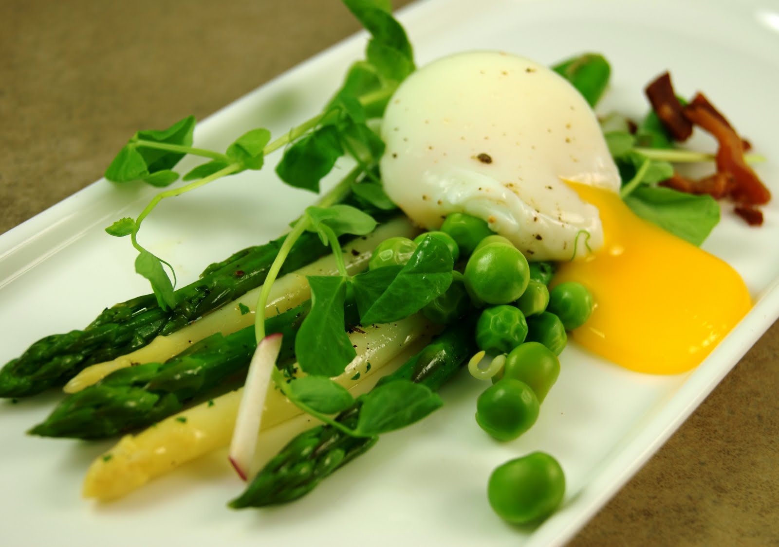 This dish consists of green and white asparagus and English peas tossed with lemon oil, Lucky Leaf Garden pea tendrils, crisp shiitake mushrooms, rendered pancetta and a soft poached egg.