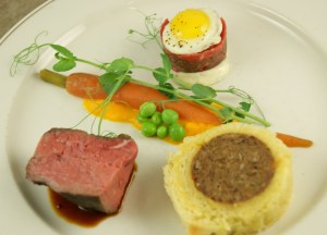 This trio of beef was created to serve with a 1998 Silver Oak Cabernet, a big wine requiring big flavors to stand up to it. It had several components including: Prime CAB flat iron steak that was bonded with Activa and cooked sous vide, braised beef short rib wrapped in brioche, steak tartare with sunny side up quail egg and bearnaise aioli, and sous vide heirloom carrot with spring peas, pea tendril and carrot-coriander puree.