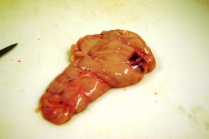 Veal sweetbreads are a delicacy that are rarely seen on menus these days. Sweetbreads are the thymus gland of the cow, found both in the neck and near the heart. Typically the one that is used in the kitchen is the one in the neck, which tends to be more tender and flavorful.