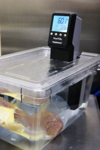 The beef tenderloin was seasoned with kosher salt and ground black pepper before being bagged with whole butter, sliced shallot, smashed garlic cloves, rosemary and thyme. It was cooked for around an hour and a half at 60 degrees celcius in the immersion circulator. Once it came out, it was chilled in an ice bath and held for service. When it was time to reheat, it was taken out of the packaging and seared in a sauté pan before being quickly finished in the oven. After resting for about ten minutes under a heat lamp so the internal juices could re-distribute, it was sliced and finished with coarse sea salt.