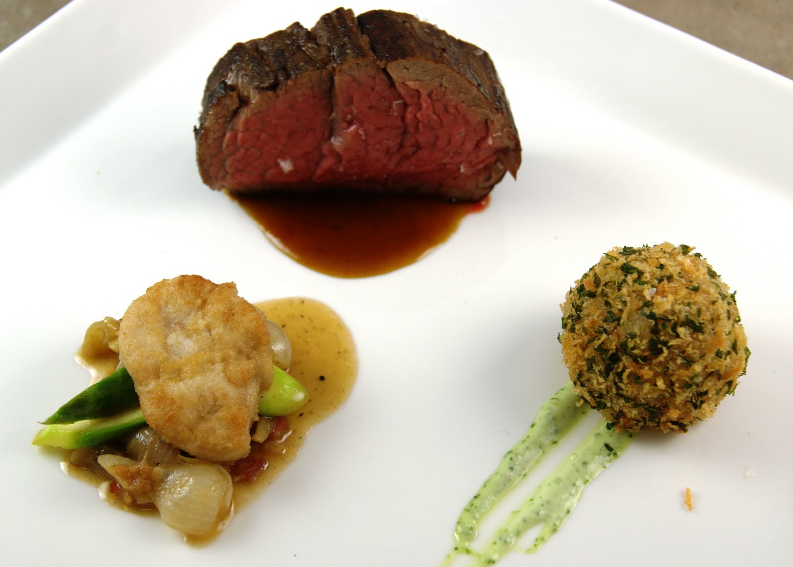 The beef tenderloin was seasoned with kosher salt and ground black pepper before being bagged with whole butter, sliced shallot, smashed garlic cloves, rosemary and thyme. It was cooked for around an hour and a half at 60 degrees celcius in the immersion circulator. Once it came out, it was chilled in an ice bath and held for service. When it was time to reheat, it was taken out of the packaging and seared in a sauté pan before being quickly finished in the oven. After resting for about ten minutes under a heat lamp so the internal juices could re-distribute, it was sliced and finished with coarse sea salt.
