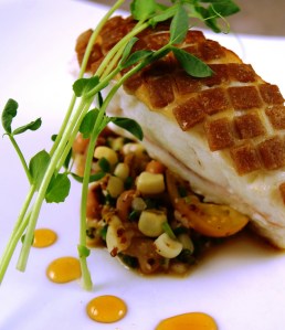 Accompanying the snapper is a late summer succotash consisting of corn, black eyed peas, sungold cherry tomatoes and fresh herbs.