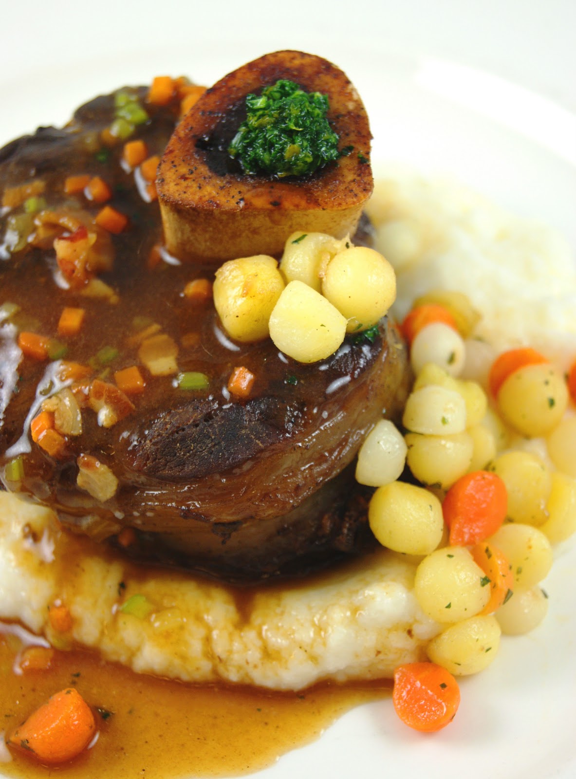 First, the veal shanks were seasoned with kosher salt and black pepper, then lightly dusted with all purpose flour with a little onion powder and granulated garlic. The shanks were seared until lightly browned, then removed from the pan. Then, medium diced onion, celery and carrots were added to the pan and cooked until caramelized. Tomato paste was added and cooked down until almost dry, then the pan was deglazed with red wine. Once the wine had cooked down to almost sec, chicken stock and veal stock were added in equal parts, along with fresh rosemary, thyme and crushed garlic. While waiting for the wine to cook down, butchers twine was tied very tightly around the shanks to help them keep their shape during the cooking process. The veal shanks were then placed back into the pan, into the stock, and allowed to just come to a boil. Once it had boiled very briefly, the pan was covered and placed into a 350 degree oven for five hours.