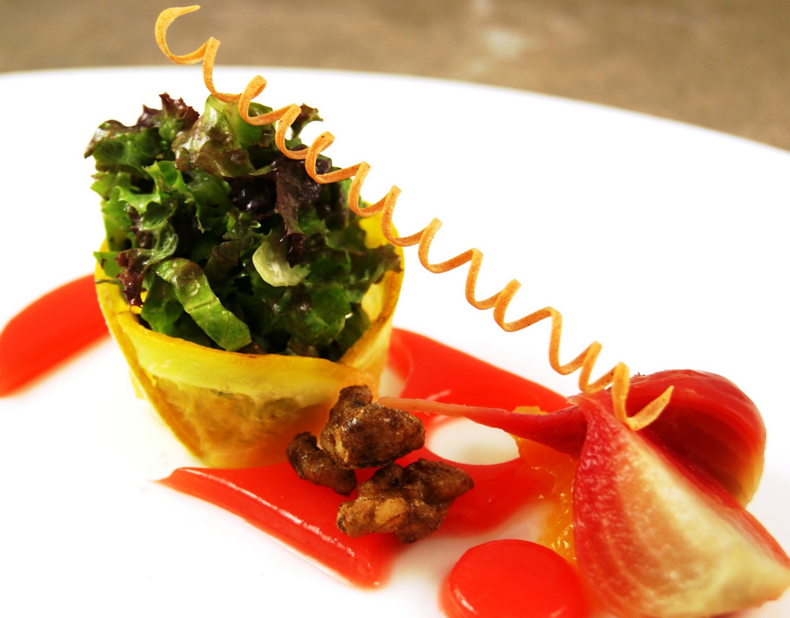 This was a nice, light seasonal salad featuring some great Fall flavors and some fun textures. On this plate is Tega Hills greens tossed with a red wine and roasted apple vinaigrette, blood orange gelatin, local baby beet, candied walnut and a spiced pumpkin tuile.