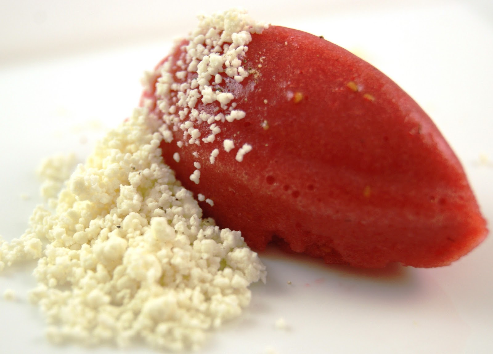 This was a photograph that I took of an intermezzo for one of our dinners by pastry chef Rebecca McLean. It is Strawberry Sorbet with Olive Oil Powder. Producing powders from fats was described briefly in a previous post, seen here.