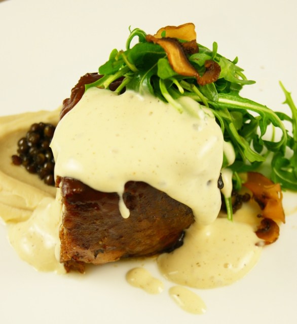 For this dish pork shoulder was braised for six hours while completely submerged in duck fat. The shoulder was portioned after chilling down completely. For service it was seasoned and seared, then glazed with fortified veal stock before going into a low oven to gently reheat. It was glazed a couple more times with veal stock while in the oven to add color and deep, rich flavor.