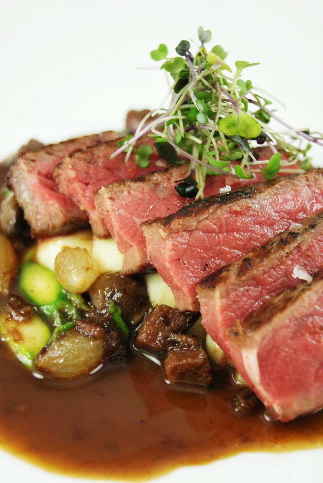 The New York Strip was portioned, then placed in cryovac with whole butter, kosher salt, freshly ground toasted black pepper, crushed garlic, sliced shallot, fresh thyme and rosemary. The steaks were cooked at 125 degrees for thirty minutes and then chilled in an ice bath. To serve, the steaks were re-heated in a cast iron skillet in a 1600 degree broiler to give them a nice crust. They rested for several minutes after coming out of the broiler before slicing so the juices could re-distribute. The strip was then sliced and finished with coarse ground sea salt.