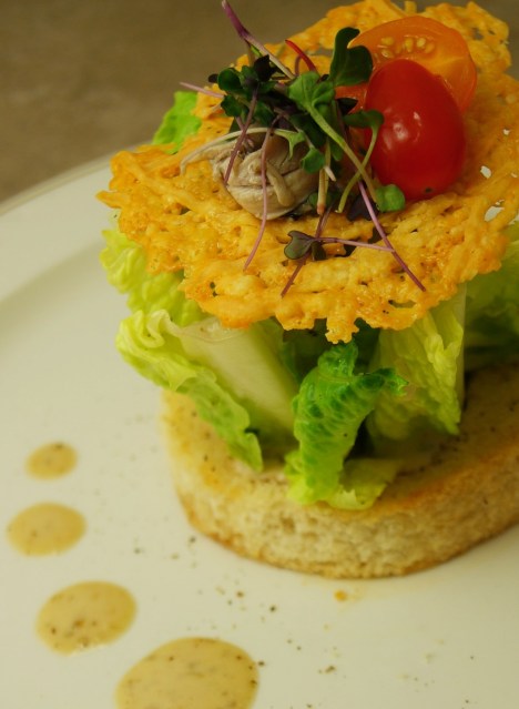 A Parmesan crisp tops the salad with a garnish of white anchovy, grape tomatoes and Lucky Leaf Gardens micro greens.