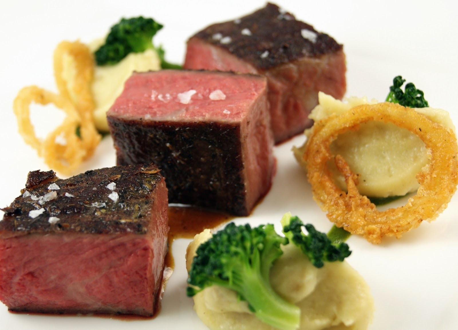 The caramelized onion mashed potatoes were prepared by caramelizing julienned yellow onions in a saute pan over low-medium flame with clarified butter, salt and pepper.  The onions have to be stirred constantly to prevent burning and require about twenty minutes to fully caramelize.  They were then placed in a blender and pureed thoroughly, then the puree was placed back over a low-medium flame and reduced while again stirring constantly.  The puree was added to freshly milled  Idaho potatoes along with hot heavy cream, whole butter, kosher salt and white pepper.
