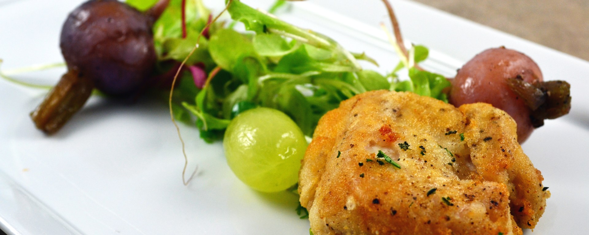 This was an interesting dish prepared for a Chefs Table recently, combining the sweet and meaty flavor of sweet breads with a tart salad, peppery radishes and sweet, peeled grapes.