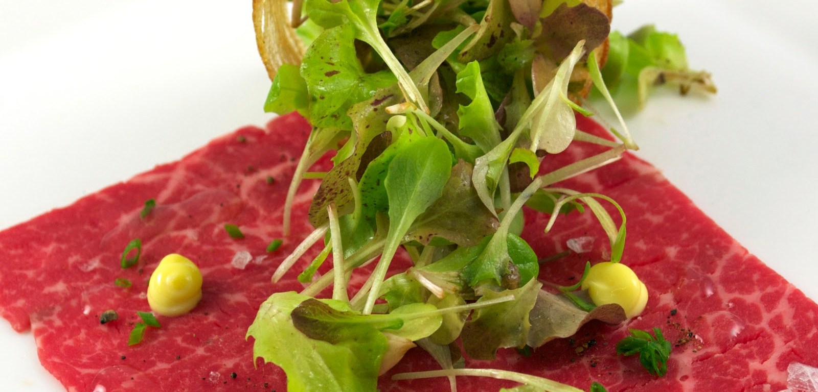 Rather than cook it, it was wrapped into a cylinder then frozen over night. The next morning it was unwrapped, then seared quickly in a cast iron skillet in the 1600 degree broiler. It was then sliced thinly on the meat slicer and trimmed. The beef was arranged on the plate and finished with coarse sea salt, freshly ground and toasted black pepper, sliced chives and several dots of roasted garlic aioli.