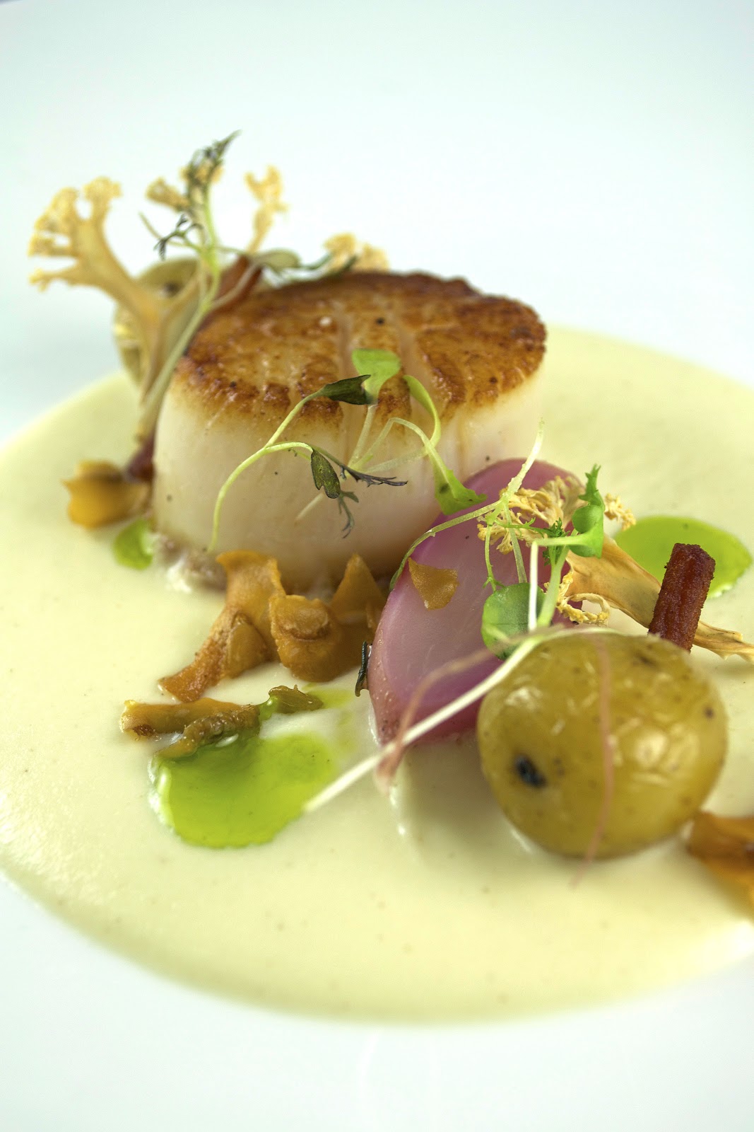 For this dish I used the “Twice Cooked Scallop” recipe from the “Ideas in Food” cookbook by Aki Komazawa and Alexander Talbot. The scallops were brined in a .05% salt water solution for ten minutes, then cooked sous vide at 122 degrees for thirty minutes before shocking in an ice bath. The scallops were fired to order in a smoking hot cast iron skillet.