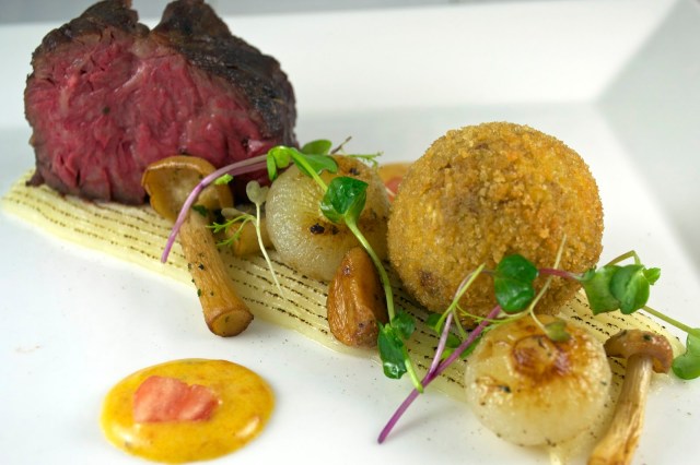 The beef short rib was braised, then chilled and diced. A ragout was prepared with the short rib, a reduction of the braising liquid, bacon and mirepoix. The ragout was thickened lightly with agar. The ragout was then chilled and then goat cheese and fresh rosemary was folded into it. One of the beneficial properties of agar is that it has a relatively high melting point, 140 degrees Fahrenheit. The chilled ragout was shaped into spheres then breaded and fried. The spheres hold their shape long enough for a crust to form in the fryer, the agar releases when hot and the ragout pours out of the sphere once cracked on the plate.