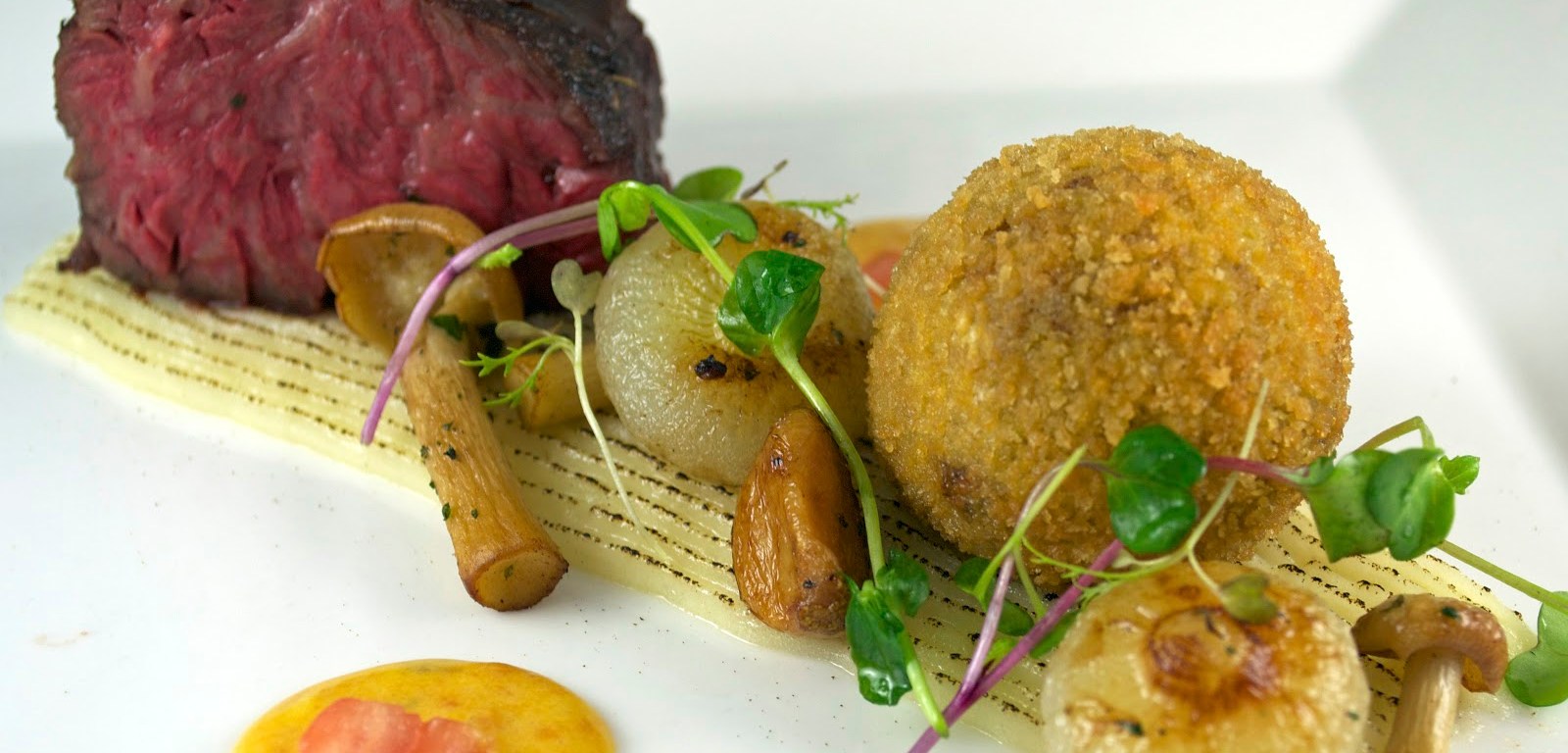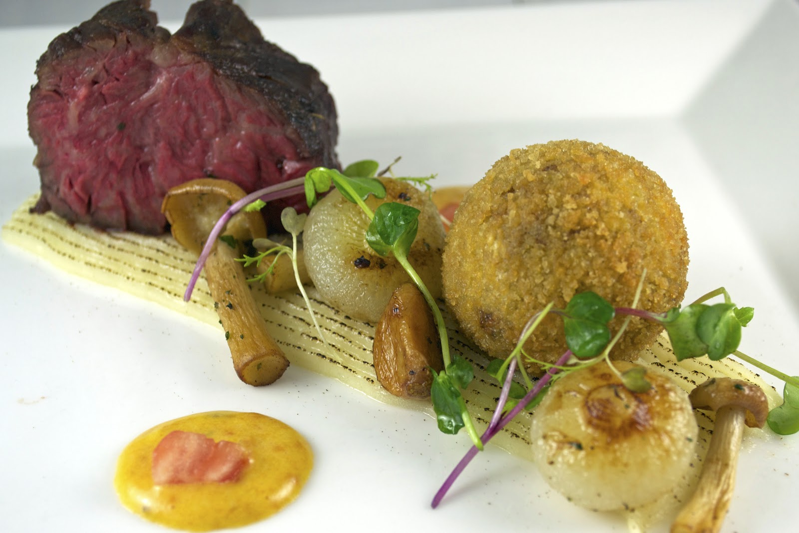 The beef short rib was braised, then chilled and diced. A ragout was prepared with the short rib, a reduction of the braising liquid, bacon and mirepoix. The ragout was thickened lightly with agar. The ragout was then chilled and then goat cheese and fresh rosemary was folded into it. One of the beneficial properties of agar is that it has a relatively high melting point, 140 degrees Fahrenheit. The chilled ragout was shaped into spheres then breaded and fried. The spheres hold their shape long enough for a crust to form in the fryer, the agar releases when hot and the ragout pours out of the sphere once cracked on the plate.
