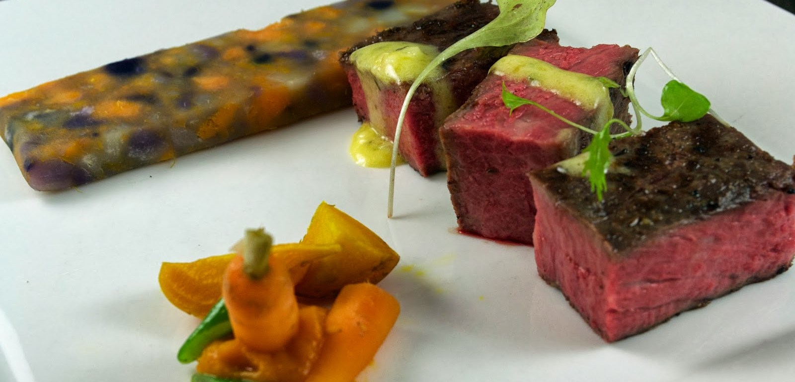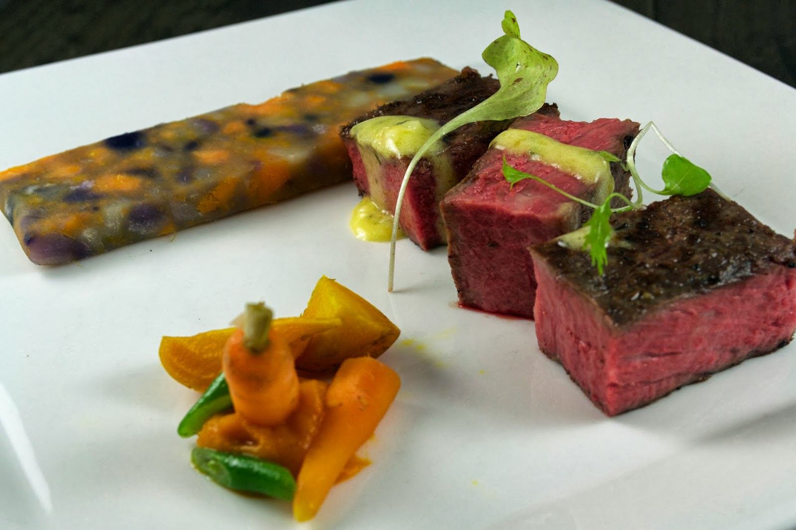 This CAB Prime New York Strip was prepared the same way as the beef tenderloin in the previous post, with a coriander cure, hickory cold smoke and a long and low sous vide process.