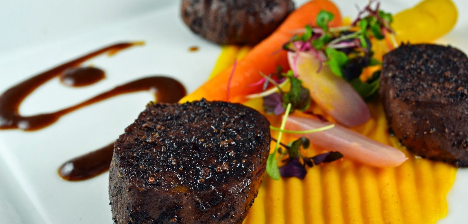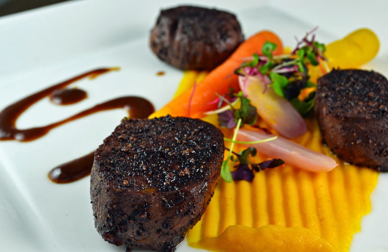 For this dish we prepared the venison sous vide, allowing it to cook at 137 degrees Fahrenheit for 1.5 hours to allow connective tissues to slowly break down without the risk of over cooking. The loins were cooked whole and then chilled, then portioned once cooled. When we were ready to serve the dish the individual medallions were seared on high heat, then seasoned with the espresso and cacao nib rub. Applying the rub before searing will cause the rub to burn and create an unpleasant, bitter flavor.