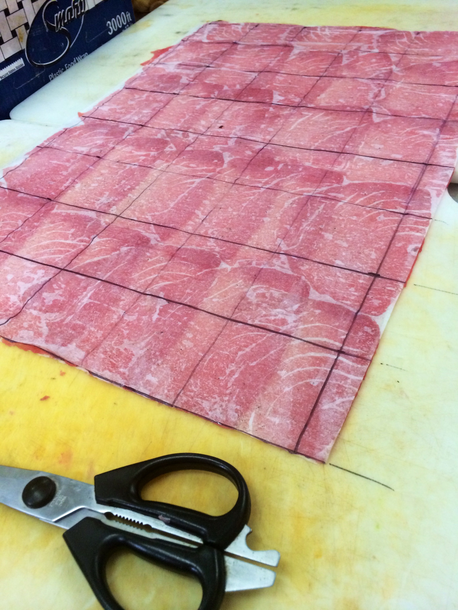 Once the tuna was arranged on the parchment, a yard stick and a Sharpie were employed to mark off a grid for portioning (see below). Very sharp kitchen shears worked well to portion the tuna without tearing the paper-thin meat. The individual squares were then held for service and the parchment made plating extremely efficient.