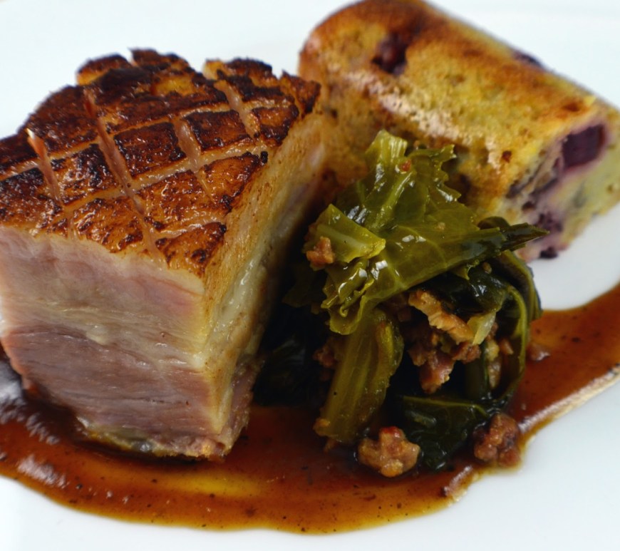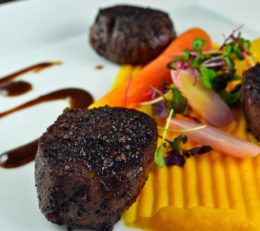 Venison, or deer meat, has enjoyed a rise in popularity lately as the cost of beef rises and a growing demographic of health-conscious consumers seek out lower-fat options. Venison has a deep, rich flavor which can be similar to beef, though it can sometimes have a “gamey” note and even more tender cuts can be tough comparable to beef or pork. Both of these characteristics … Continue reading Espresso and Cacao Nib Crusted Venison Loin, Puree of Butternut Squash, Early Spring Vegetables